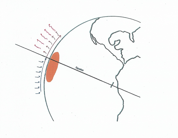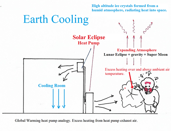 Cooling can also be induced by atmospheric tidal dragging. This heating effect being due to the Eclipse’s dynamic influence on the localized temperatures. In other words, the accumulation of moisture will see the corresponding accumulation of heat and this is a consequence of the tropical ocean losing both heat and water. The Gravitationally moist air being pulled from the tropics will add to this heating effect.